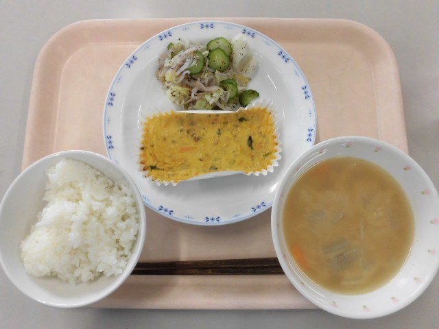 と卵を一緒に混ぜて、一人分ずつカップにそそいで焼きました。彩りもきれいな料理です。
