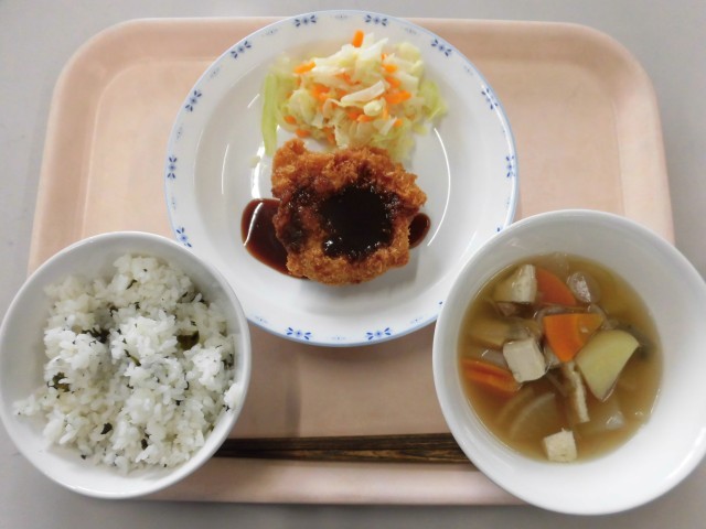 運動会応援献立として、チキンカツを作りました。付け合わせや汁物に野菜をいっぱい入れたので、
