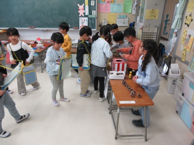 2年生がお店を開き、1年生が遊びに来ました。以前、2年生だけで実施した時よりお客さんが多く、みんな張り切っていました。素敵ない学年交流でした。
