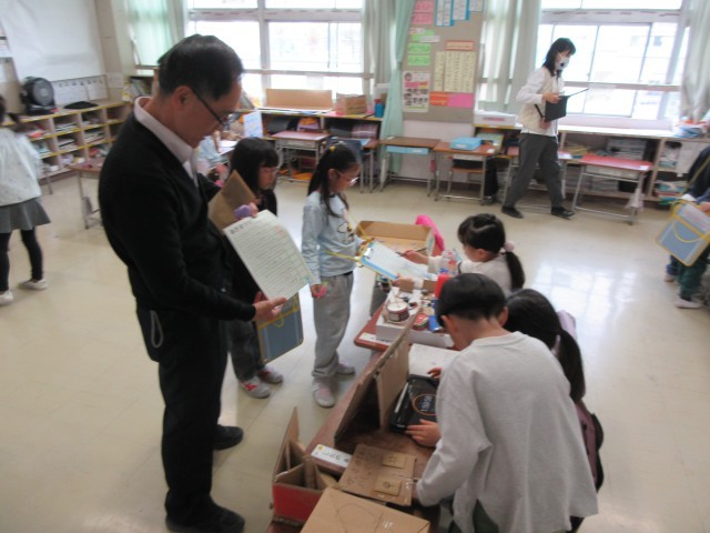 どんぐりを使った遊びができるお店を考え準備しています。看板やおもちゃ、飾りを工夫して作っています。先日、2年生のお店に招待されたことも生かして、素敵なお店が開けるといいですね。