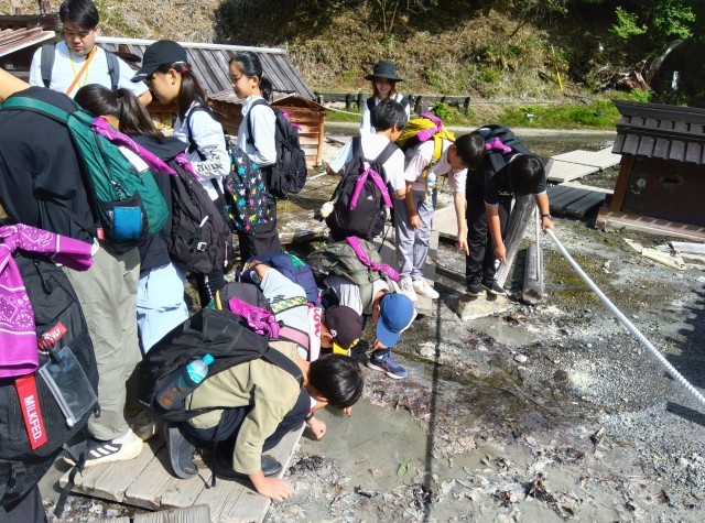源泉の見学をしています。10円玉を使って色の変化を見ています。