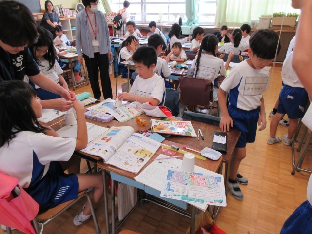 糸電話を作って音の伝わり方を学習しています。目に見えない音について、見える形で確認をして知識を深めています。