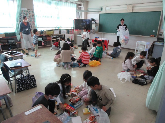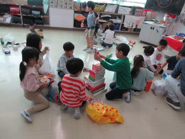 箱を使って様々な形づくりをしました。組み合わせでどのような形になるかグループで話し合ってつくっていました。