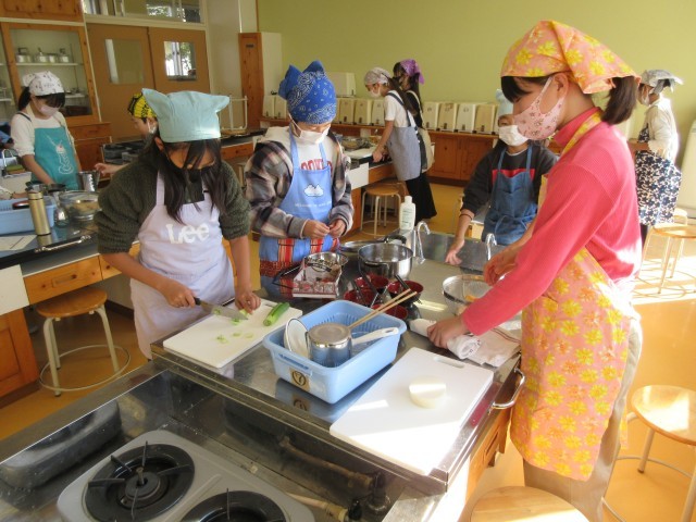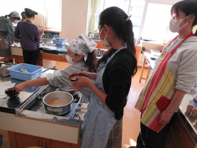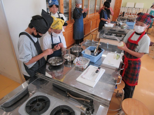 5年生がみそ汁づくりをしました。煮干しの頭とはらわたをとりだしをとって、ネギとダイコン、油揚げの入ったみそ汁をつくりました。この経験を生かし、家でもできるようになると嬉しいです。