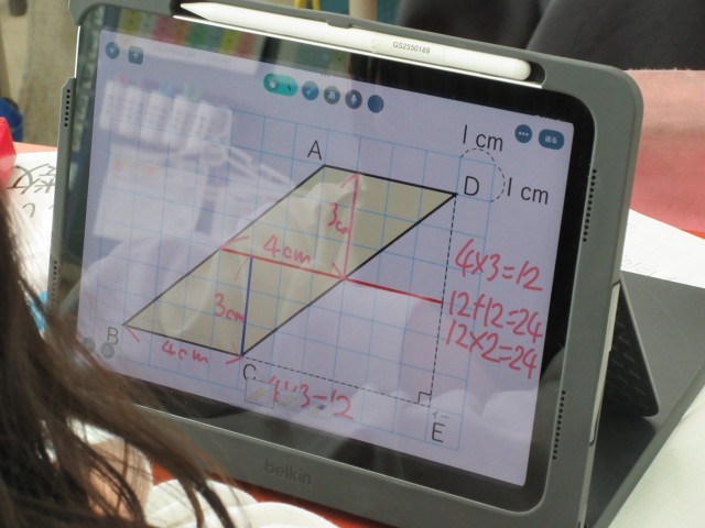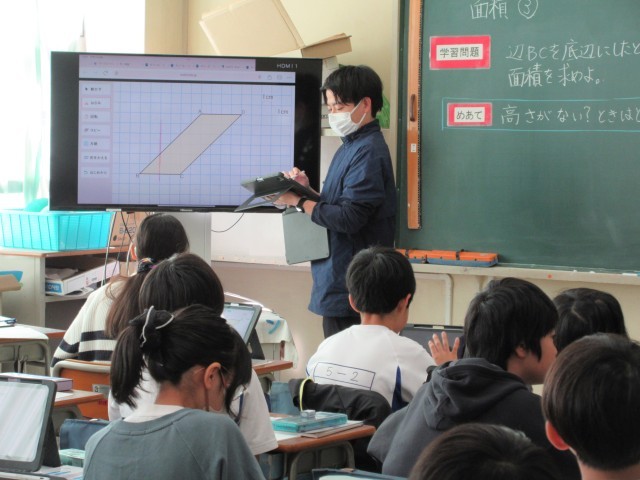 ICTを活用して図形の面積の求め方を考えています。自分の考えを上手にまとめ、友達と考えを交流してから発表をしています。