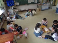 ぬいぐるみを持っている人が話をします。”全員の前に向けて話をする”、ということが保障されます。”話をする人に注目する”、ということを自然と学びます。こうして少しずつ、”話し合う”力を付けていきます。