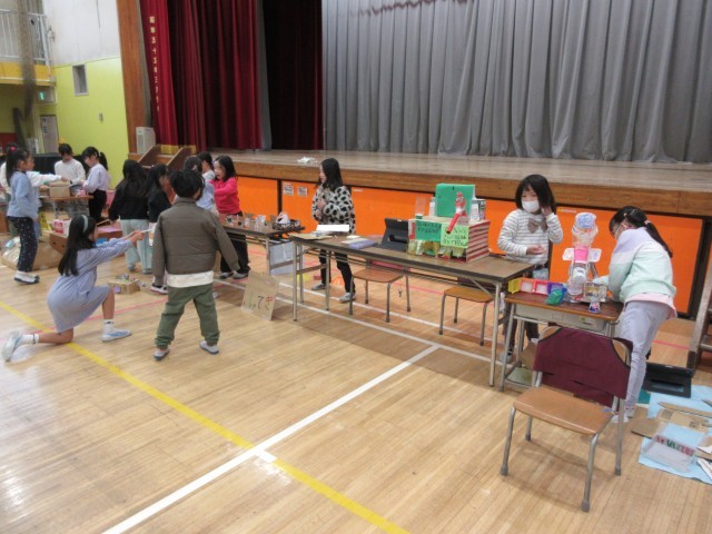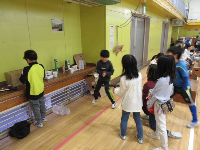 体育館でグループそれぞれが考えたお店を開きました。店員とお客に分かれ、遊びを楽しみました。