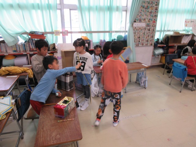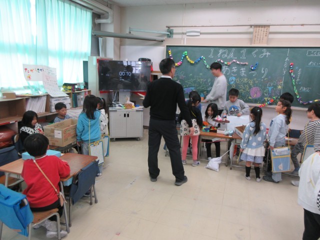 1年生が3クラス合同でお祭り(あきまつり)をしています。