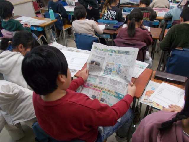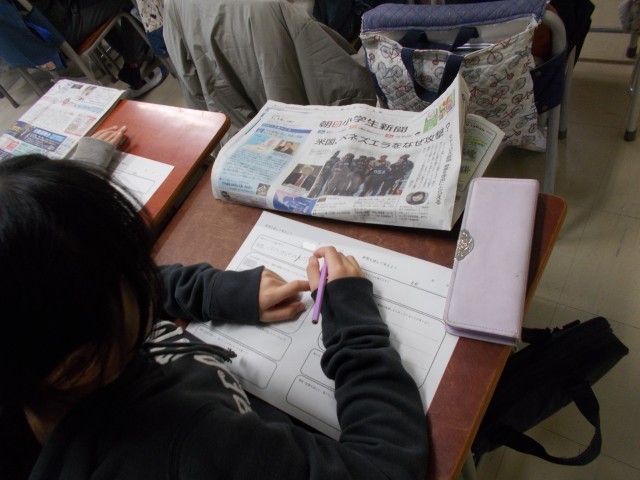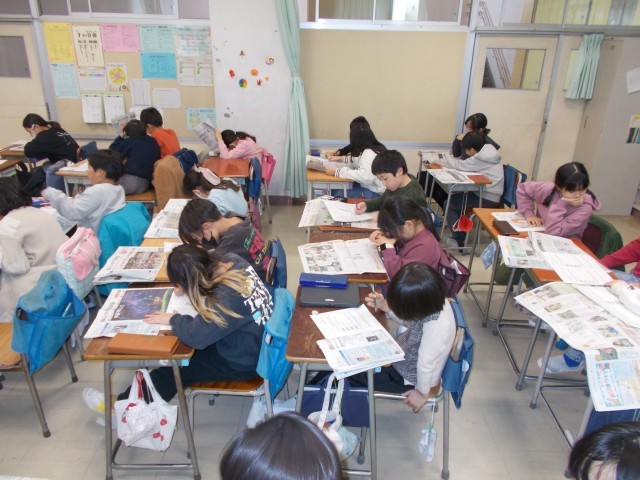 まずは、新聞を読むことからスタートです。国語の学習を生かし、”いつ”、”どこで”、”だれが”、”何をした”という視点でメモを取っていきます。自分の考えをもてるように、がんばれ4年生!