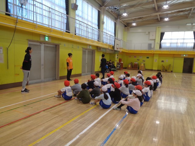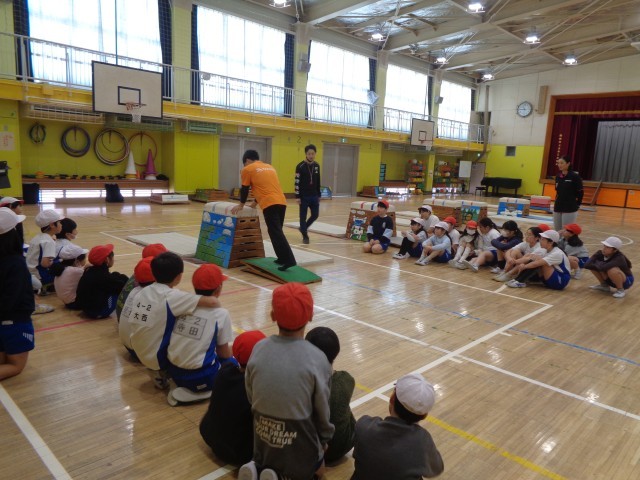 3回目の跳び箱教室です。準備運動の中で、綺麗な着地の姿勢を教わりました。その後、踏切板の違いによる膝の使い方を教わり練習をしています。