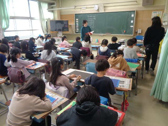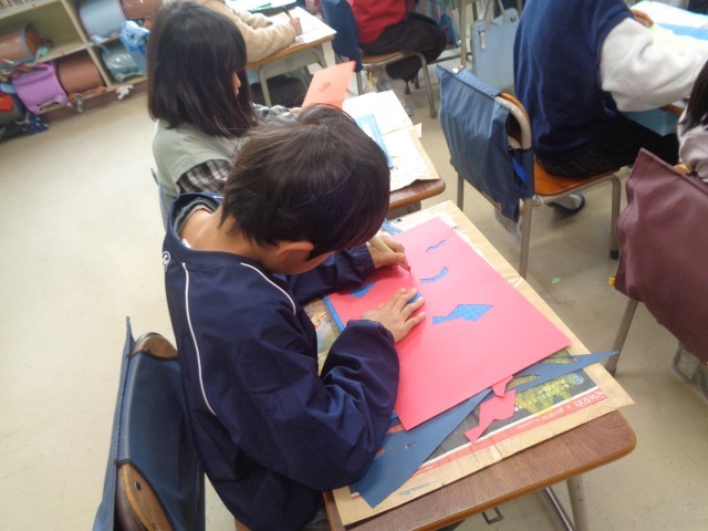 カッターを使って図工の授業をしています。慎重に動かしながら、自分の思い描いた窓を切り抜いています。みんな黙々と取り組んでいます。