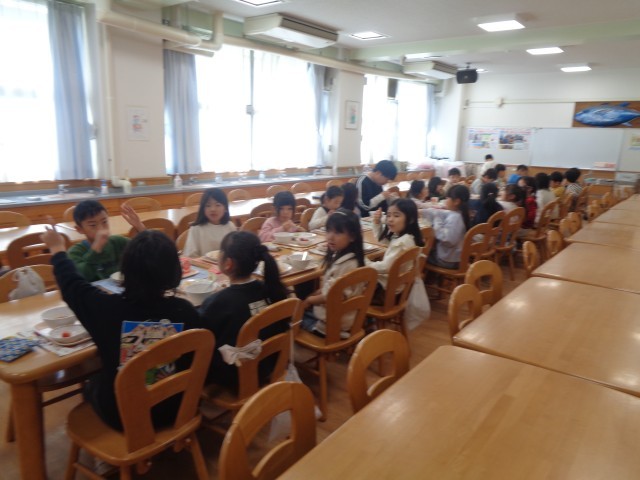 教室とは違った雰囲気で給食を食べています。会食の楽しさを感じます。