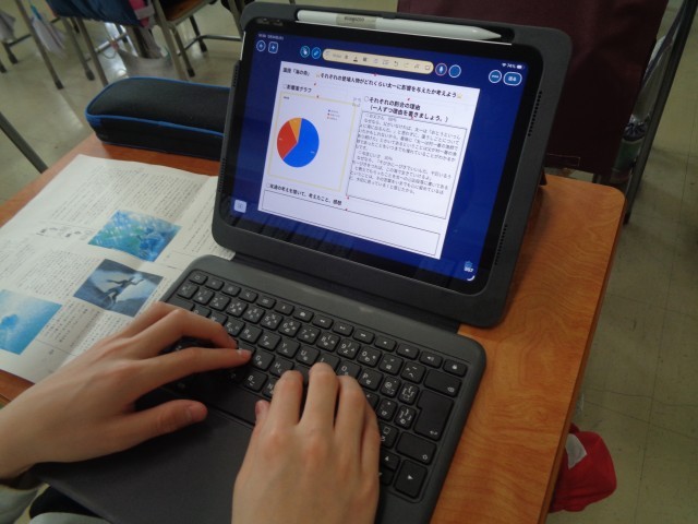 物語の読み深めをして、自分の考えをグラフを用いて説明しています。考えや感想を交流するだけでなく、一人一人の思いや読み方が見とれる授業でした。