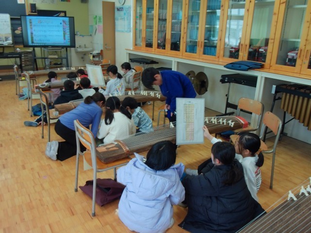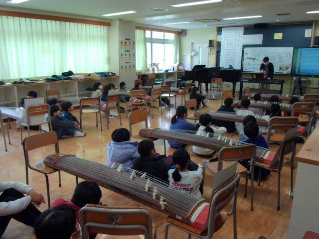 4年生が箏の授業をしています。日本の楽器に触れながら、日頃の音楽とは違う体験をしています。