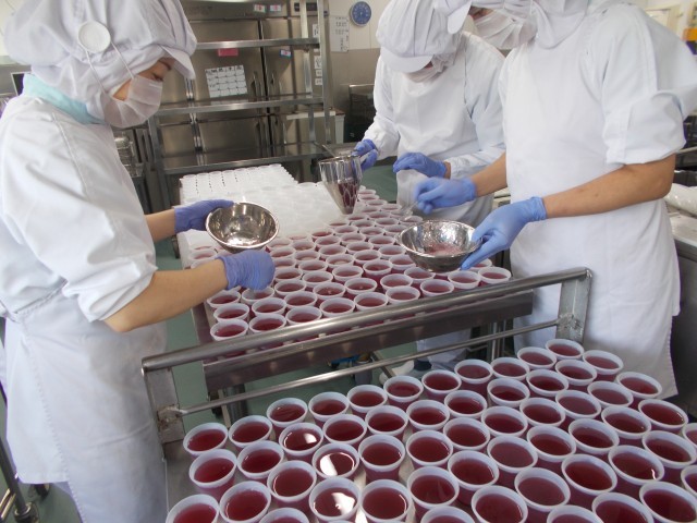 ジュース、寒天、ゼラチンで作ったゼリー液をカップにひとつずつ注ぎます。きれいに仕上がるように、表面の小さな泡をスプーンですくって取り除きます。