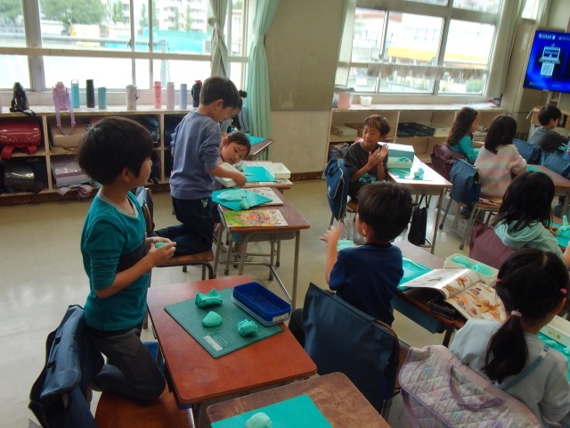 粘土を使って思い思いの作品を自由に作っています。体重をかけて薄くしたり、ひものように長くしたりして楽しそうに作っています。