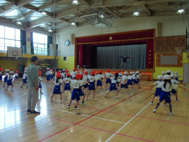 1年生の運動会練習の様子です。どのように踊るのか、担任のダンスを見て勉強しています。初めての運動会に向けて練習をがんばって欲しいです。