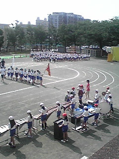 音楽係の伴奏でみんな元気よく行進しています。音楽係は行進・運動会の歌・校歌の伴奏を毎日一生懸命練習しています。
