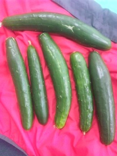 緑のカーテンはまだまだ校舎1階の3分の1ほどの高さにしか伸びていませんが、カーテンの隙間にはこんなに大きなきゅうりがあちらこちらに♪緑のカーテンはヘチマときゅうりが一緒に育っています♪