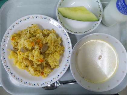 カレー粉で黄色く彩られたピラフを、季節のメロンと一緒に組み合わせました。ポテトスープの中には、野菜と鳥ガラがきいたスープに牛乳を入れた旨味たっぷりホワイトスープです。