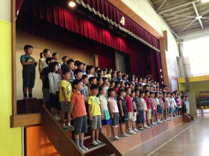 9月19日の音楽朝会では、一年生の発表でした。曲名は「レッツゴー、あしたへ」全校児童の前での発表は、ちょっと緊張した様子でしたが、みんなで心をひとつにして元気いっぱい歌いました♪