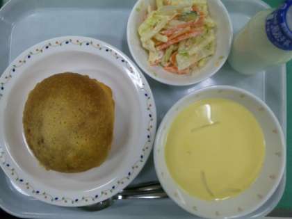 今回チャレンジしたのは豆乳のスープ。無調整のものを使用しましたが、なかなか味を付けるのに苦労しました。まず鳥ガラスープを取るのに3時間。南瓜や玉葱などの野菜からでる旨味を利用して、コトコトさらに煮込むこと1時間。「よし出来た。お味はどうかな?」完成したスープの味を見てみると…「あれっ?うすい!!」だしの旨味があまり出なかったようです。食べ終わった子供たちの評価もやや辛口。これは改善の余地があります。すぐさま調理員と反省会を開きました。結果、だしの取り方や具材の量など課題がいくつかあがりました。