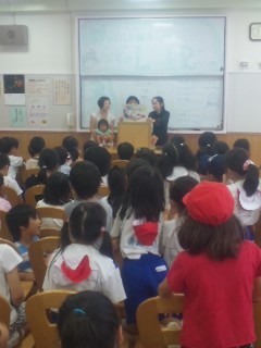 今日は中休みにランチルームにて読み聞かせボランティアの皆さんによる紙芝居を使った『ぶんぶくちゃがま』の読み聞かせがありました。
