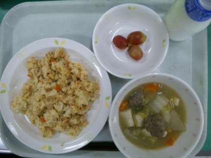 ランチルームででた質問。もちろん答えはノーです。葡萄は英語でグレープ(grape)ですね。今日は秋の果物シリーズで、マスカットが登場しました。マスカットには赤い物もあれば、緑色の物もあり、その間赤緑の物もあります。葡萄は皮と身の間に特に栄養があり、種まで食べられる果物です。台風の影響で今回は届かないかもしれないと心配しましたが、農家さんが一生懸命守ってくださったおかげで、無事給食で食べることが出来ました。農家さんの努力と、台風に負けない強さを兼ね備えたマスカットは、いつもより深みのある堂々てしたテイストでした。