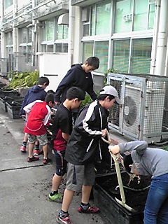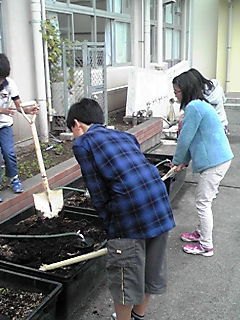 栽培委員のみんなが『よっこらせ』とプランターの土を掘り返しています。