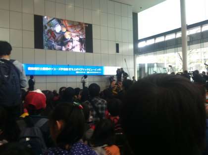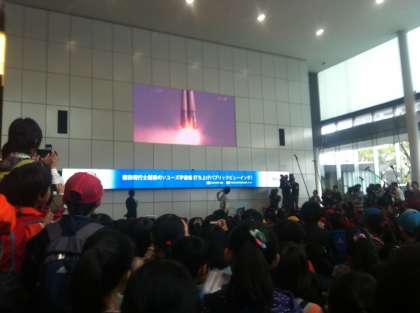 日本科学未来館で、本日行なわたソユーズ打ち上げのパブリックビューイングを見ることができました。ロケットが打ち上がると、会場からは大歓声が上がりました。若田さん、打ち上げ成功おめでとう