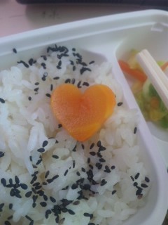 本日の青空給食のお弁当箱を開けてみたら、憧れの『ハート型にんじん』がちょこんと♪♪♪