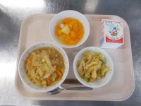 緑が映えるよう、細かく刻んだ人参とご飯を一緒に炊きあげたキャロットライスを使用。その上からグリンピースで「てんらんかい」という文字を書きました。子供たちの反応はどうかな〜?ドキドキしながら教室を回ると、「すごーぃ!」と喜ぶ子供たちの顔が一斉に迎え入れてくれました。