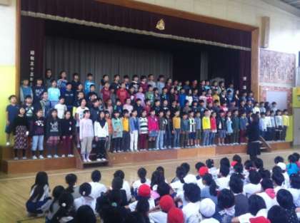 4年生が音楽朝会で、「もみじ」を歌いました。おおきな声だけでなく、とても綺麗なハーモニーで歌い、会場全員を魅了していました。高学年になっても、堂々と歌い続けてほしいと思います。