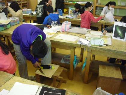 3学期の図工の授業では、ホワイトボードを作っています。デザインを考え、オリジナルの作品制作に取り組んでいます。
