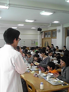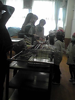 今日の親子給食は1−1です。1年生が来てくださったお父さんお母さんにちゃんと給食を配ります。