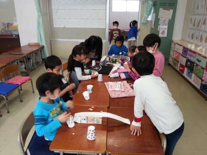 まずは、紙コップと輪ゴムを使って、ビビヨーンと飛ぶおもちゃを作るお店です!