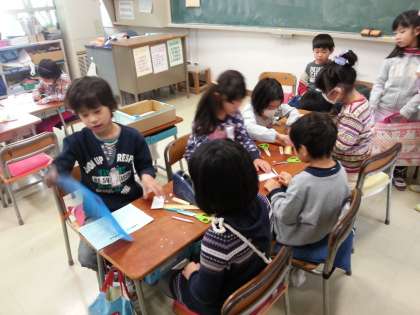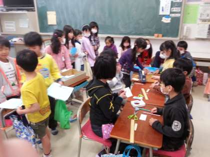 二年生が一生懸命に教えていて、どこ子もよく飛ぶかわいいピョンピョンカエルができました!!