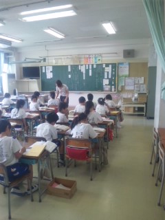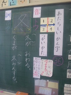 2−2の国語の授業風景です。今日は『冬』っていう字のお勉強。みんなで声を合わせて書き順を覚え、文字の形に注意して、どんな使い方をするか学んでいます。