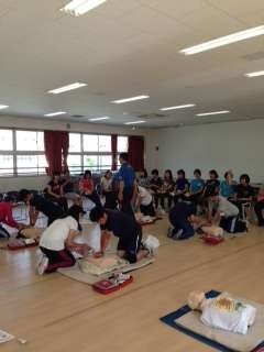 毎年、水泳指導の前に東京消防庁から講師を招き、心肺蘇生法などの救命救急研修を実施しています。子どもの命に直接関わること。全員真剣に研修しました。