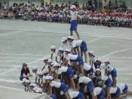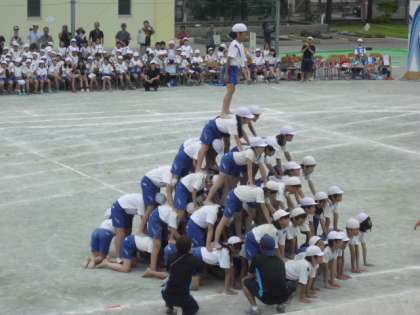 2基の50人立体ピラミッドがきまった瞬間この日一番の歓声が!子どもたちの表情からも「やったあ!」という気持ちが伝わってきました。