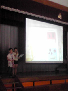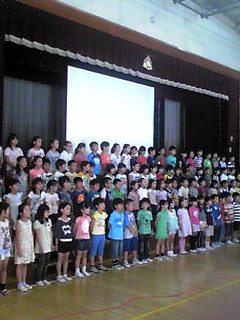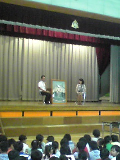 今日は千歳台小学校開校35周年の記念集会をおこないました。3年生が『芽生え』の詩をみんなで暗唱し、6年生が千歳台北遺跡について調べたことを発表し、そのあと、本校の壁画を描いてくださった谷内六郎先生のお子様でいらっしゃる谷内ひろみ様と校長先生との対談をおこないました。
