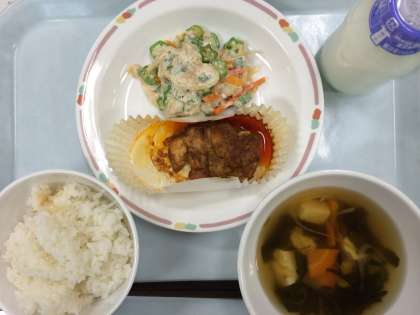 「夏の野菜を使う」「子どもたちが好きな調味料を用いる」この2つを元に考えた献立が「ツナとオクラの和えもの」です。こだわったのはドレッシング。当初は醤油とみりんだけだったのですが、玉葱をすることで甘みを足し、夏らしくさっぱりした味になるようにお酢を加えました。そして、子どもが好きな調味料・・・。悩んだ結果マヨネーズを使うことにしました。マヨネーズ、すりおろした玉葱、お酢、醤油、オリーブ油を混ぜ合わせ、一度加熱して良く混ぜ、冷やします。野菜の上にドレッシングをかけ、最後にマヨネーズで和えれば完成です。ランチルームでは特に男子から人気を集めていました。ただ反省点が・・・。それは見た目です。和えるとマヨネーズとオクラは見た目が少し落ちてしまうことが今回の反省点。次はきっと見た目も味もよい夏サラダを作りたいと思います!
