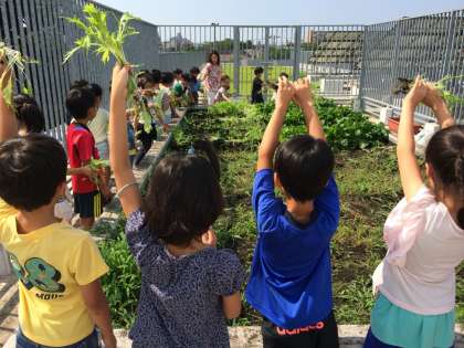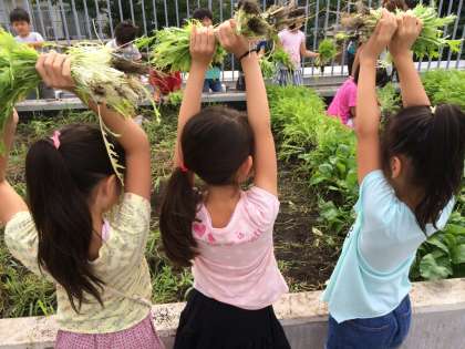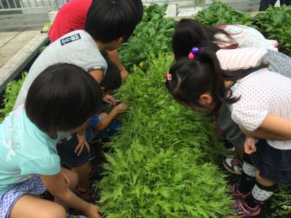 写真は水菜を朝8時から収穫する子どもたちです。立派な水菜を前に子どもたちは「すごい!私たちが作った水菜が今日は給食に出るんでしょ?やった!」と朝からウキウキしている様子。最後はきれいに洗ってから、「宜しくお願いします」と声をそろえて厨房に送り届けてくれました。