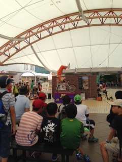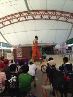 ワールドスクウェアでのパフォーマンスショー。日差しの暑い中、タイミングよくショーが始まりました。自転車乗りの曲芸を中心とした演技に子供たちは釘付け。これもきっと思い出の一つになるでしょう。