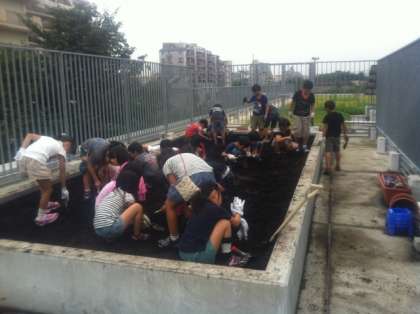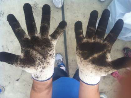 今日は土に肥料などを混ぜました。土の中からは、6年生が1学期に育てていたジャガイモの残りがたくさん出てきて大喜び。あと、たくさんの虫と幼虫が…。軍手を真っ黒にしながら一生懸命に耕してくれたので、土がふかふかになりました。