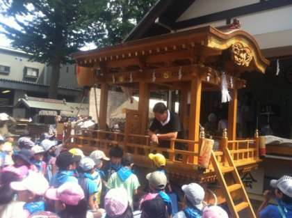 今日の夜から始まる廻沢神社のお祭りの準備を見学に行きました。神社ができた由来や一年間の祭りを教えていただいたり、大きな太鼓や山車を見たりしました。町のお祭りを町の人たちも子供たちも楽しみにしている様子が伝わってきました。