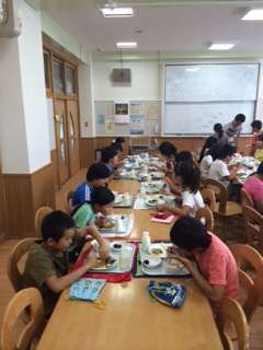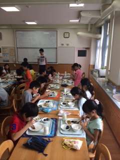 今日は4年3組がランチルーム給食です。みんな仲良くいただきま〜す。今日のメニューは秋刀魚と栗♪