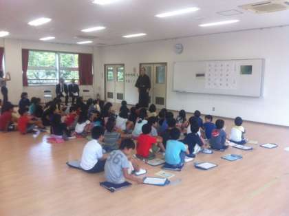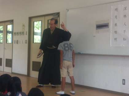 ゲストティーチャーとして、井村先生をお招きして、日本語で漢詩の授業をしました。まずは、王維の「竹里館」のうたの意味を想像したり、書き下し文を読んで覚えたりしました。その後、井村先生に、上手な読み方を教わりました。初めは言葉を区切らずになんとなくダラダラと読んでいた子供達も、言葉をはっきりと発音して読むようになりました。すると、うたの内容が伝わってくるような素晴らしい読み方になっていました。また、詩吟も披露していただきました。初めて聞く読み方に子供達も担任も圧倒されてしまいました。お腹から声を出す練習として、声の長さ対決をするなど、一時間楽しく授業を受けました。これを機に、中学年、高学年とどんどん読み方が上手になっていくことを期待しています。