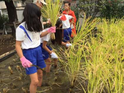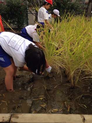 台風の影響で田んぼはぐちゃぐちゃでしたが、かまを使って、立派に育った稲を刈りました