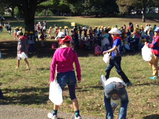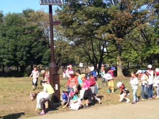 どんぐり拾い、そしてお菓子も食べて、いよいよ祖師谷公園ともお別れ。最後に全員で公園内のゴミを集めるクリーン作戦をしました。これも大切な活動です。よく頑張りました。